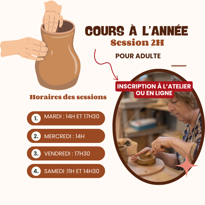 Cours à l’année de poterie pour ados et adultes. Les cours sont collectifs en séances de 2 heures.